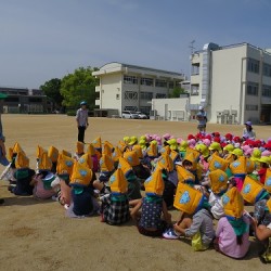 本年度初めての避難訓練では、地震を想定し、先生の誘導に従って避難しました。年長さんは、これまでの経験から防災頭巾を被って避難場所に移動しました。子どもたちは、いつもと違う雰囲気に緊張していました。 避難訓練が終わって各クラスに戻り、先生から身の守り方や避難方法などのお話を聞きました。その後、み…