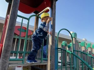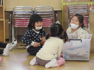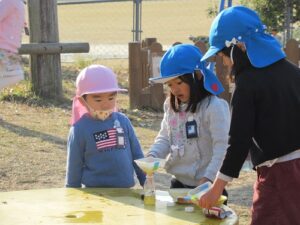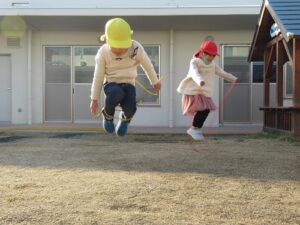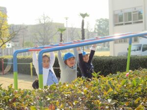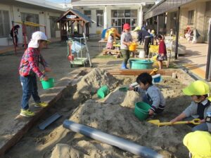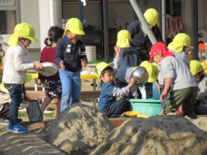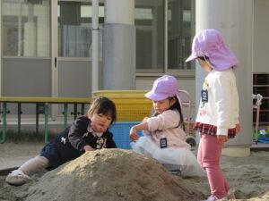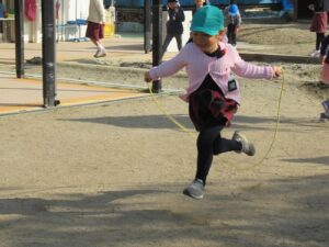 東園庭です。しっかり体を動かして、いつの間にか体がほっかほか!年長さんに年少さんも仲間入りして一緒に過ごす姿も見られました。