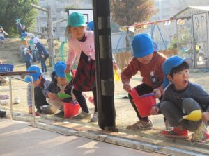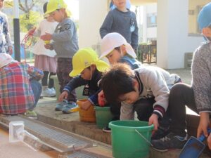 園庭の溝のところで、網をはずして溝掃除をしている子を発見!冬休みを前に、年長さんたちが、幼稚園をさらにきれいにしようと、掃除をしています。そんな姿に触発されて、年中さんも仲間入り。