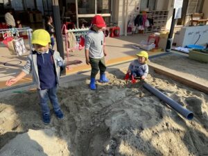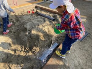 寸暇を惜しんで砂場で遊んでいる子もいます。水を使って遊んでいる子も発見。樋に水を流しては、流れてきた水が跳ね上がる様子を、「水の花火だ!」と表現し、歓声を上げて何度も試す姿も見られました。
