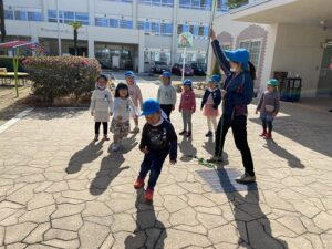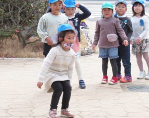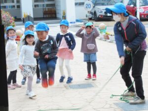 大縄に挑戦している子たち。「はい」「はい」「今!」「今!」