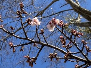 よーく見ると枝の先に、ピンクの花がほころんでいます。