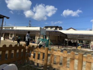 ピンクの花に見守られながら、子どもたち、今日も元気に過ごしています。