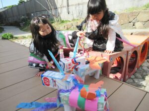 子どもたちは身の回りの材料を組み合わせてオリジナルの衣装やユニコーンを作って、想像をふくらませています。