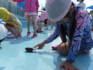 まずは注意事項の確認です。「おさない・かけない・しゃべらない・とびこまない・笛の合図で集まる」掃除のときだけでなく、プールで水遊びをするときも大切な約束ですね。