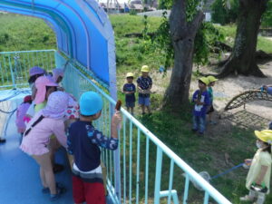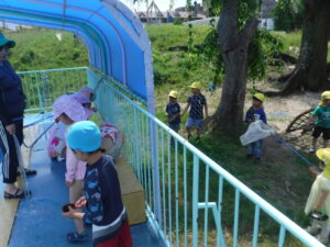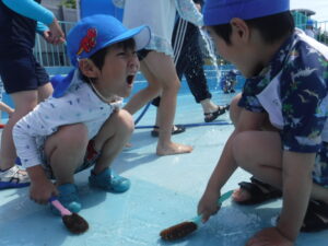 6月7日火曜日、梅雨の合間に久々の晴れとなりました。もうすぐ始まる水遊びに向けて年長児がプール清掃をするために晴れてくれたようでした。
