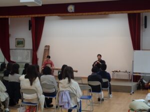 お二人で筝と尺八の二重奏「春の海」を演奏してくださったり、尺八や筝の音の出る仕組みや楽器の歴史などをお話してくださったり、お筝の体験をさせてくださったりと盛りだくさんの40分間でした。