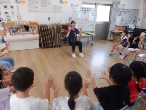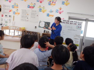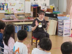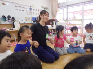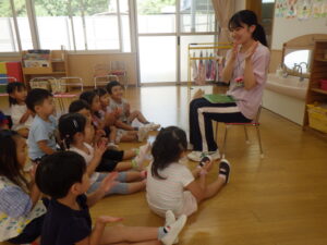 また、降園前のひとときには、楽しいゲームや手遊び、絵本の読み聞かせをしてくれ、子供たちの笑顔がたくさん見られました。