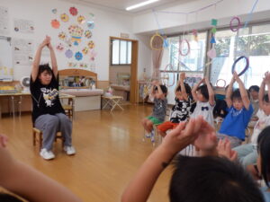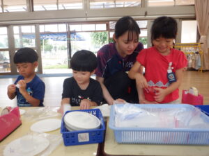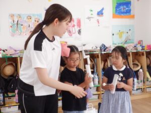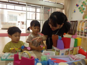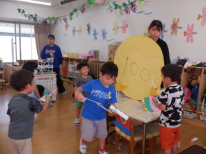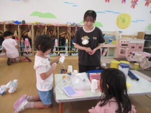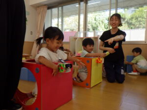 それぞれの実習生が、魚捕りや跳ぶおもちゃ、空気砲、ロケット、動物園ごっこ、滑らすおもちゃ、ぐらぐら亀タワーなど、楽しい遊びを提案してくれました。子供たちは、新しい遊びにわくわくしながら、実習の先生とのかかわりを楽しんでいました。
