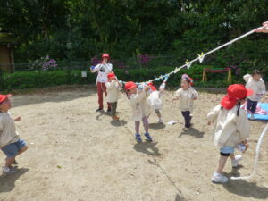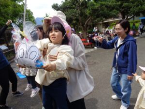 最後に、クイズ大会をしました。ほとんどの子が正解する問題もありましたが、ゾウの問題では正解したのが1人だけで、たくさんの子供たちが悔しがっていました。その後、おやつ取りゲームをして、おやつを持ってにこにこ笑顔で帰っていきました。