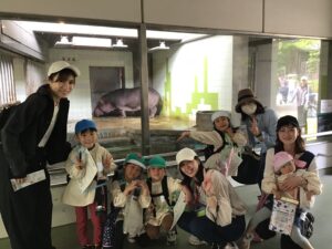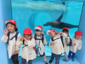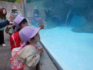 年少さんは、親子で手をつないだり、お話したりしながら楽しく動物を見て回りました。見えにくいときは、おうちの人に抱きかかえてもらい、真剣に動物を探しました。ペンギンやアシカの水槽の近くでは、泳ぐスピードの速さに「わ~!」と歓声が上がりました。