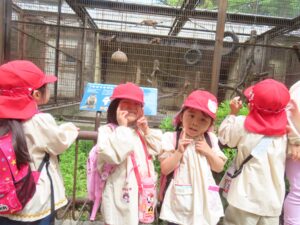 年中さんは、学級みんなでゆっくりと動物を見ながら歩きました。途中、ワニが水中を泳ぐ様子を見て喜んだり、チンパンジーが網の上を歩いて渡る様子を見て、歓声を上げたりしました。