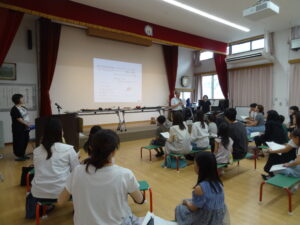 初回の子育てミニ講座は、毎年恒例 井上 洋一園長による講座です。今年度は、アカンパニストとしてご活躍の金子 敦子 先生と、おはなしJAMSから砂田 ひろみ 先生にお越しいただきました。