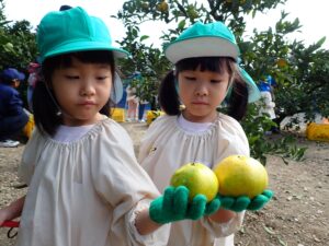 さあ、いよいよみかん狩りです。初めに農協のみかん狩りの先生に、みかん狩りのはさみの持ち方と使い方、みかんの採り方を教わりました。枝を2回に分けて切ることを教えていただきました。さて、どうしてでしょう。年長のみんなは、覚えているでしょうか。