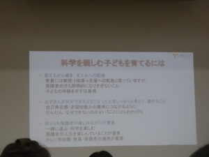 聴講された方からは、「博物館を何度も訪れることの価値や、動物園の飼育員さんが相手に合わせて説明を変えているというお話から、子どもの「なんで?」に寄り添い、興味を深めていく環境づくりの大切さに気づかされました。科学を“特別なもの”ではなく、日常の中の楽しさとして一緒に味わう視点を、これからの子育ての中でも大切にしていきたいと思います。」