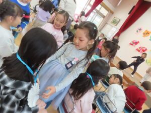 次は年中さんの出番です。初めにこれまでいろいろなことを頑張ってくれた年長さんに金メダルを渡しました。年長さんにメダルを掛けながら、「いままでありがとう」「だいすきだよ」など、感謝の気持ちを添えていました。プレゼントを渡した後は、踊りです。年長さんが教えてくれた「カリスマックス」です。曲名を言うと、年長児が「うわー、やったー」とざわめき、踊れる人みんなで楽しみました。