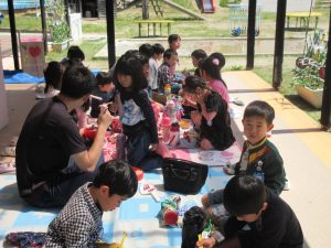 ブルーシートをしいて、あたたかいお日様のもと、なんだか遠足気分です。
