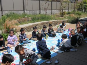 ぽかぽかいい天気です。陽気に誘われて、年長さんはどちらのクラスも外でお弁当を食べています。