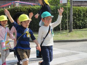 年中さんと年長さんで手を繋ぎ、横断歩道では手を挙げて出発です。