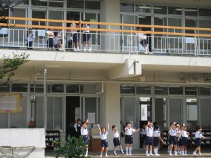 暑い中、歩き続けていくうちにだんだんと、言葉数が少なくなっていきます。「暑いね」というつぶやきも聞こえてきます。そんなとき、「おはよう」「おーい!」という元気な声が。小学校の副校長先生や先生方、卒園したお兄さんやお姉さんたちの声でした。要所要所で次々に声を掛けられて、子どもたちもまた元気に歩みを進めていきます。