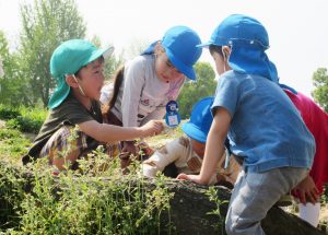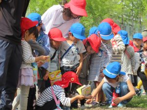中学校で生き物を見付けたようです。年中さんが持っている本に載っているテントウムシのようです。歓声をあげながらしっかりと観察します。