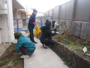 年長さんの裏庭。これまで工事の間ずっとそのままになっていたので、たくさんの草が生えていました。