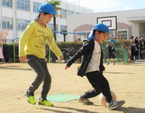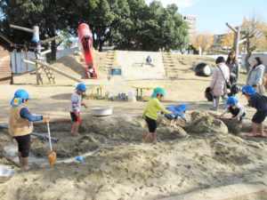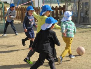 園庭では、今日もサッカーや砂場遊び、坂滑りなどをして楽しむ子がたくさんいます。