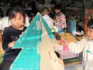 12月12日 木曜日。ご飯を食べた後の年長さん。テラスでは、劇がさらに盛り上がるように、早速、小道具作りに取り組んでいます。
