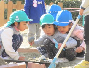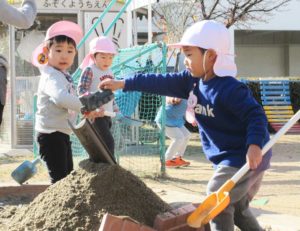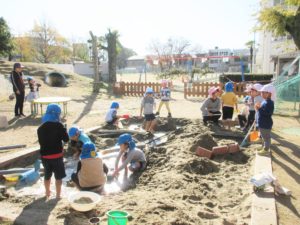 12月13日 金曜日。寒いけれど、年長さんの砂場にはたくさんのお友達が集まっています。