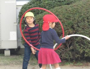 小学校の中庭では、フラフープをころがしたり、ぴょんぴょん跳んだり・・・。