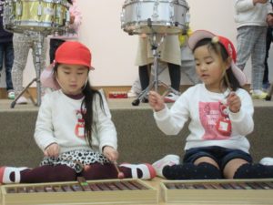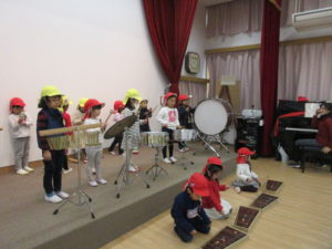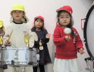遊戯室にいる年中さんが、シンバルや小太鼓、大太鼓などを元気よく奏でています。