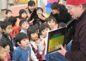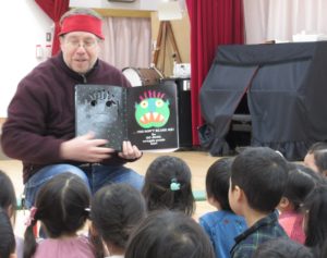 扉を開いてみると、ピーター先生が生まれたアメリカの言葉で、絵本のお話の読み聞かせをしてくださっていました。