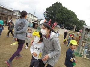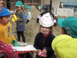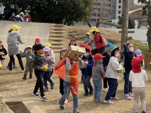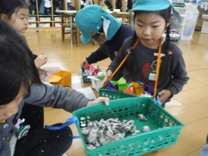 作った入れ物や豆は、年中さんや年少さんにプレゼントしに出掛けていきます。