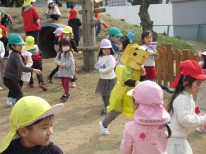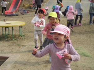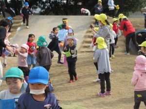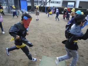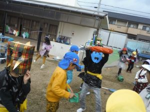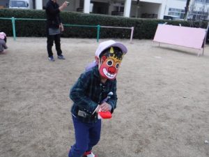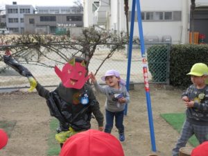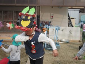 さあ、年長さんの放送の合図で豆まきのスタートです。鬼さんが一斉に園庭に走り込みます。みんな、歓声を上げながら豆をまきます。