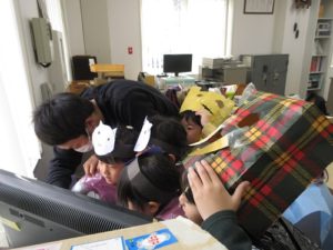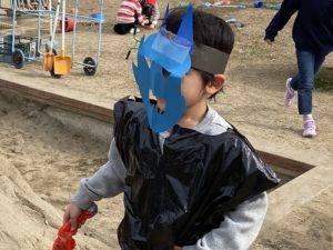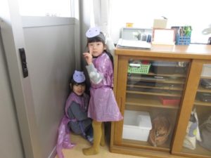 そして豆まきに向けて、鬼に変身して、年少さんや年中さんに見つからないようにそっとかくれて始まる時を待ちます。