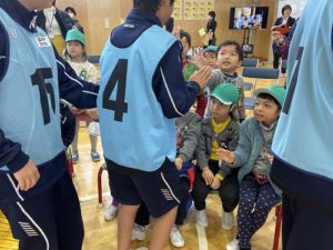 「附属幼稚園のみなさん、とくしんピックにも是非来て、応援してほしいな。」そんなオファーもあり、すっかり仲良くなったお兄さん、お姉さんと、「とくしんピック。での再会を約束して体育館を後にしました。