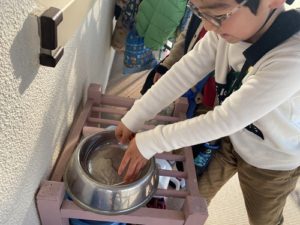 子どもたちは、昨日仕込んでおいたたらいや入れ物の水が凍っているか、興味津々。