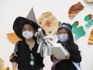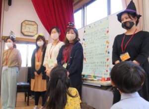 魔女やテレビで見たことのある番組の人物が、附属幼稚園にお菓子を持って遊びに来ました。
