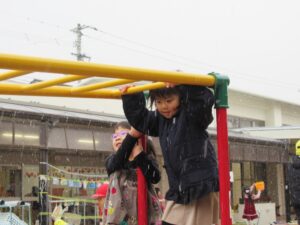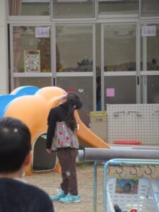 喜んで遊具で遊ぶ子。容れ物を持っている子もいます。