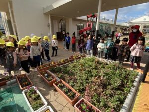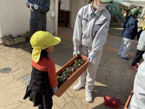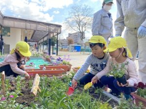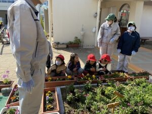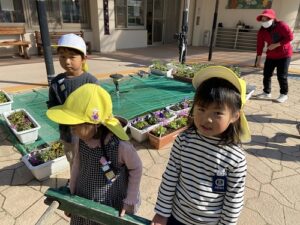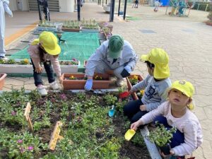幼稚園の花壇をさらにきれいにしようと、ピンクや黄色、赤・・色とりどりのお花を持ってきてくださいました。