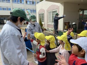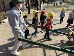 お昼前の時間に、小学校の運動場の向こうから、リヤカーを引いたお兄さん、お姉さんが附属幼稚園に向かって歩いてきてくださっています。