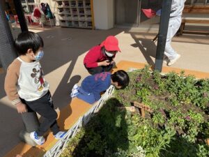 すっかりきれいになった花壇を前に、お花に花を近づけて甘い香りにうっとりする子、しばし色の美しさに見入る子、お花に話しかける子、