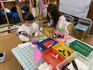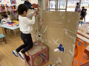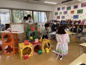 年長さんは友達と相談し、作ってみては、年少さんや年中さん・先生たちの反応を試してみます。
