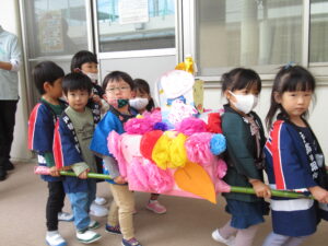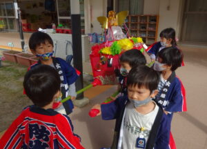 今日は、地域の伝統行事である秋祭りをみんなで楽しもう!と、「おまつりごっこ」を行いました。