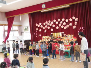 みんなが作ったひな飾りとお誕生会の飾り付け係さんが作った飾りがあり、桃の節句の雰囲気を感じる会場でお祝いをしました。