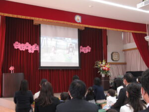 次に、年長さんからのお祝いのメッセージを見ました。ブランコや滑り台などの遊びを教えてくれて、わくわくしましたね。今日は来られなかった年長さんから「一緒に遊ぼうね。」の呼び掛け、嬉しかったですね。