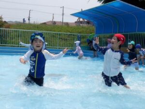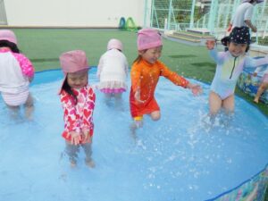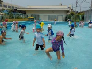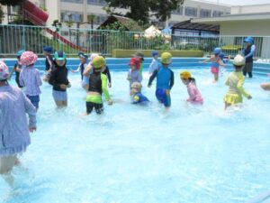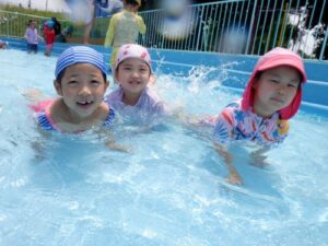年中児も1日目はビニールプールで肩慣らしをしましたが、2回目からは大きいプールにレッツゴー!昨年度は浮き輪をつけていましたが、今年はなくても平気です。水でっぽうで競争したり、ワニ泳ぎやもぐりっこをしたり、1年ぶりのプールに大喜びです。