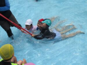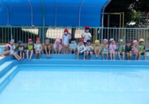 年長児は3回目のプール。さすがベテランです。ワニ泳ぎもカニ泳ぎも自由自在。フープくぐりや宝探しも大得意。みんなでダイナミックに盛り上がりました。自分たちで磨いたプールはピカピカで透き通っています。とっても楽しかったね。