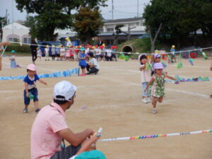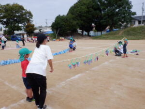 年長児は、使った道具を元に戻したり、ゴールテープを持ったりして、年中児や年少児のお手伝いもしました。