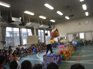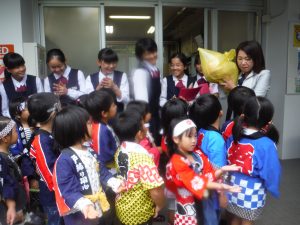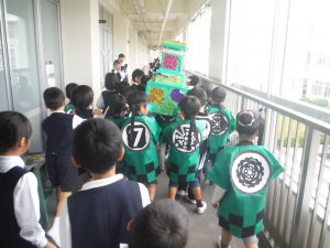 年長さんは附属小学校へ、年中さんは附属中学校へ練り歩きに行きました。元気な「わっしょい」の声が校舎に響いてお兄さんやお姉さんたちも思わすにっこりしていました。